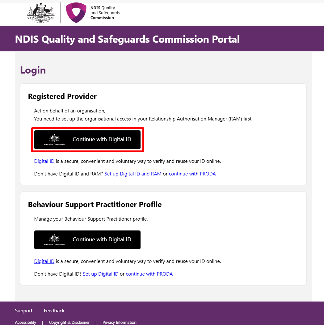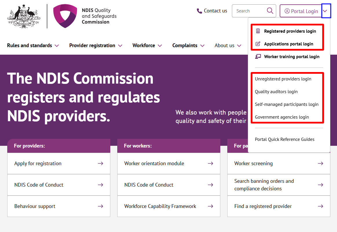 Visit the NDIS Quality and Safeguards Commission website. Click on the 'Portal Login' button, then choose a portal from the drop-down menu.