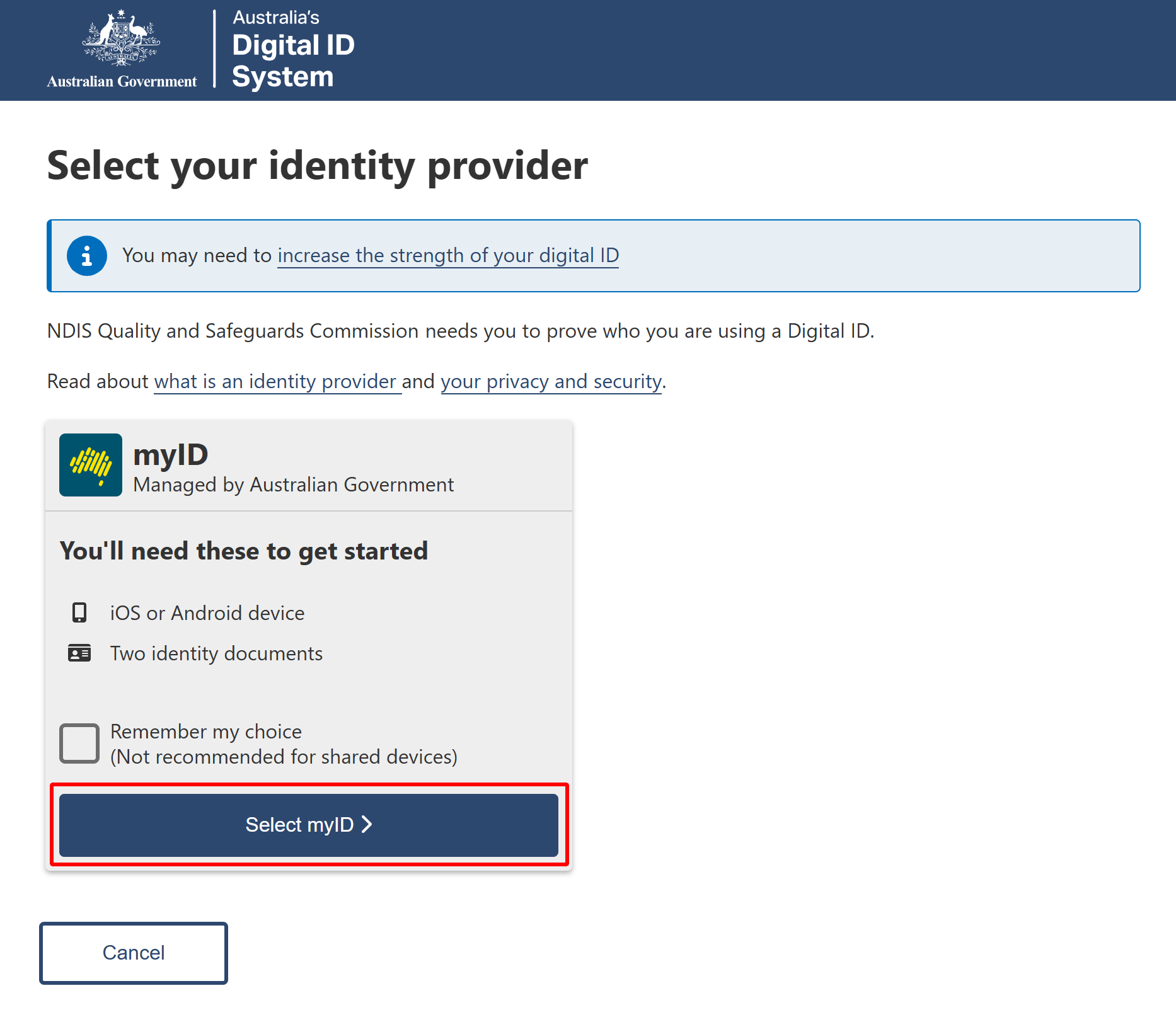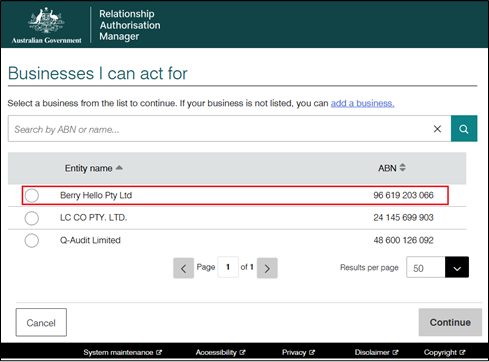 If you have authority for multiple provider organisations, you will be directed to the RAM Australian Business Number (ABN) selection page, where you must select the box that appears before the organisation you wish to represent. If you only have authority for one provider organisation, you will not see this page.Image