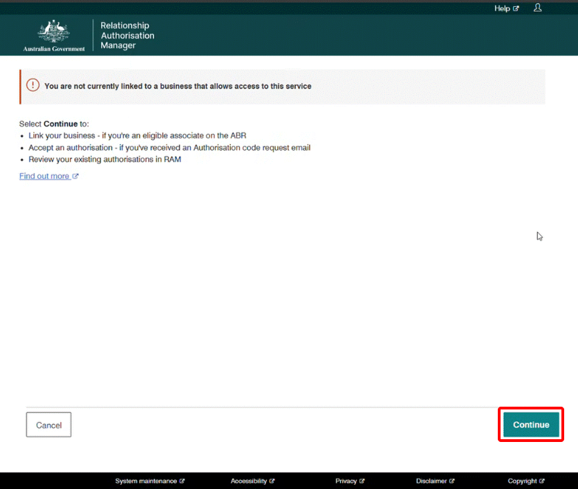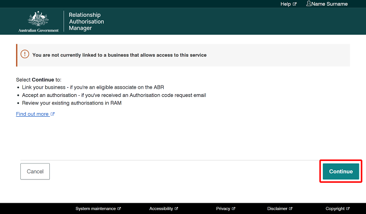 If you haven't been given authority for any businesses, you'll be directed to a page that describes the situation and your next steps. Click the 'Continue' button and follow the process for gaining authority to act on behalf of a business. If you need support with this process, please see RAM help or call the Australian Taxation Office (ATO) on 1300 287 539 (select option 3, then option 1).