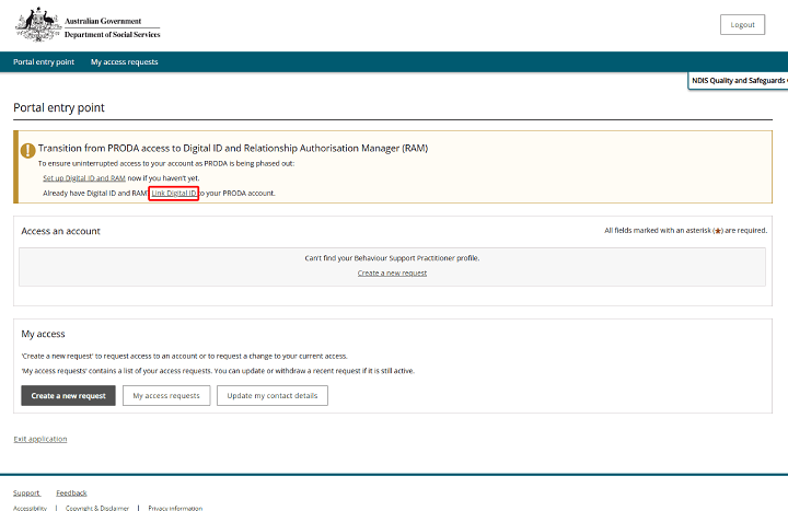 When you get to the portal entry point, you'll see an alert about transitioning from PRODA to myID and RAM.